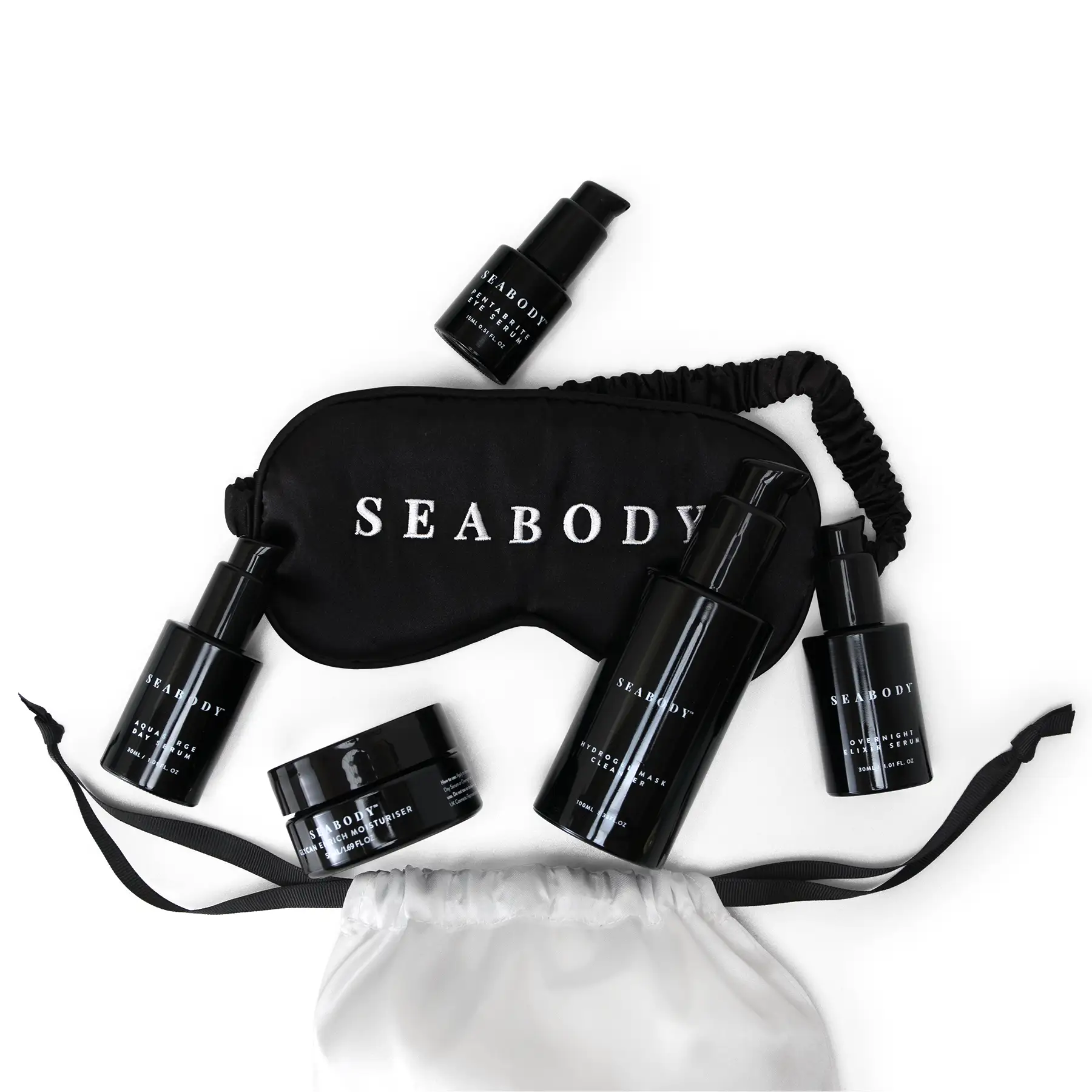 Unlock Seabody’s day-to-night system featuring a cleanser/mask, moisturiser, eye cream, hyaluronic serum, and a retinol palmitate serum for night.
